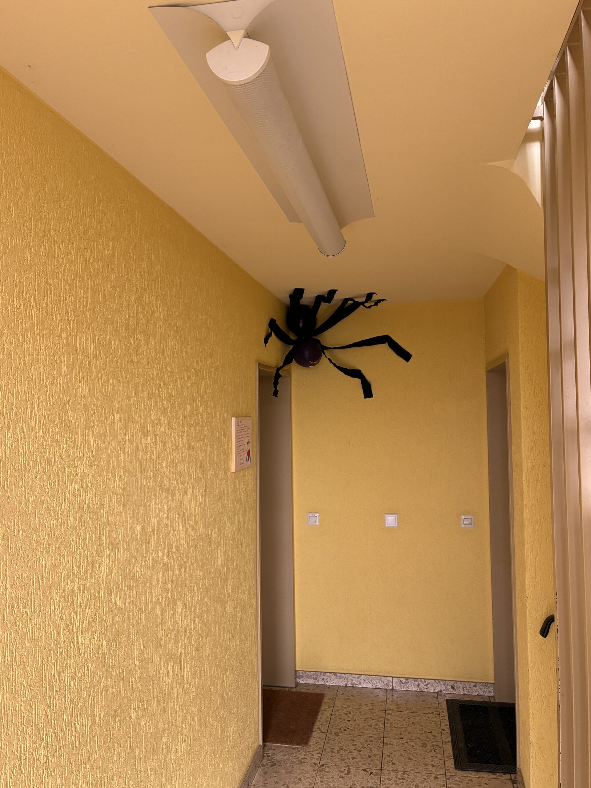 Da hat uns doch ein paar Tage vor „Halloween“ dieses „niedliche Tierchen“ empfangen. Zum Glück bestand dieses sechsäugige Monster nur aus Luftballons und Pappmaché sowie aus Krepppapier… Aber wenn man nichtsahnend das Treppenhaus betrat, konnte einem schon der Schrecken in die Glieder fahren. Trotzdem nett, unsere Nachbarn… 😉 Ähnliche Beiträge: Wie die Zeit vergeht…